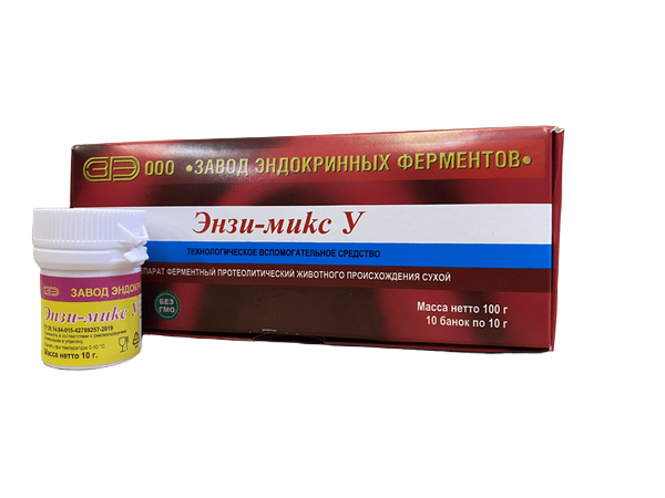 ЭНЗИ-МИКС У– энзимный препарат животной природы, содержащий комплекс кислых протеиназ, предназначен для применения в мясной промышленности для обработки мясного сырья. Ферментный состав препарата сбалансирован по степени воздействия на различные белки мяса и мясных систем, применяющихся в технологии получения мясных продуктов. ЭНЗИ-МИКС У работает в мясной системе аналогично внутриклеточным ферментам (катепсинам). Он является их синергистом и обладает дополнительными качествами, которые позволяют ему воздействовать в более широком диапазоне технологических параметров, а также влиять на те белковые системы, на которые внутриклеточные ферменты не действуют или оказывают действие в незначительной степени.